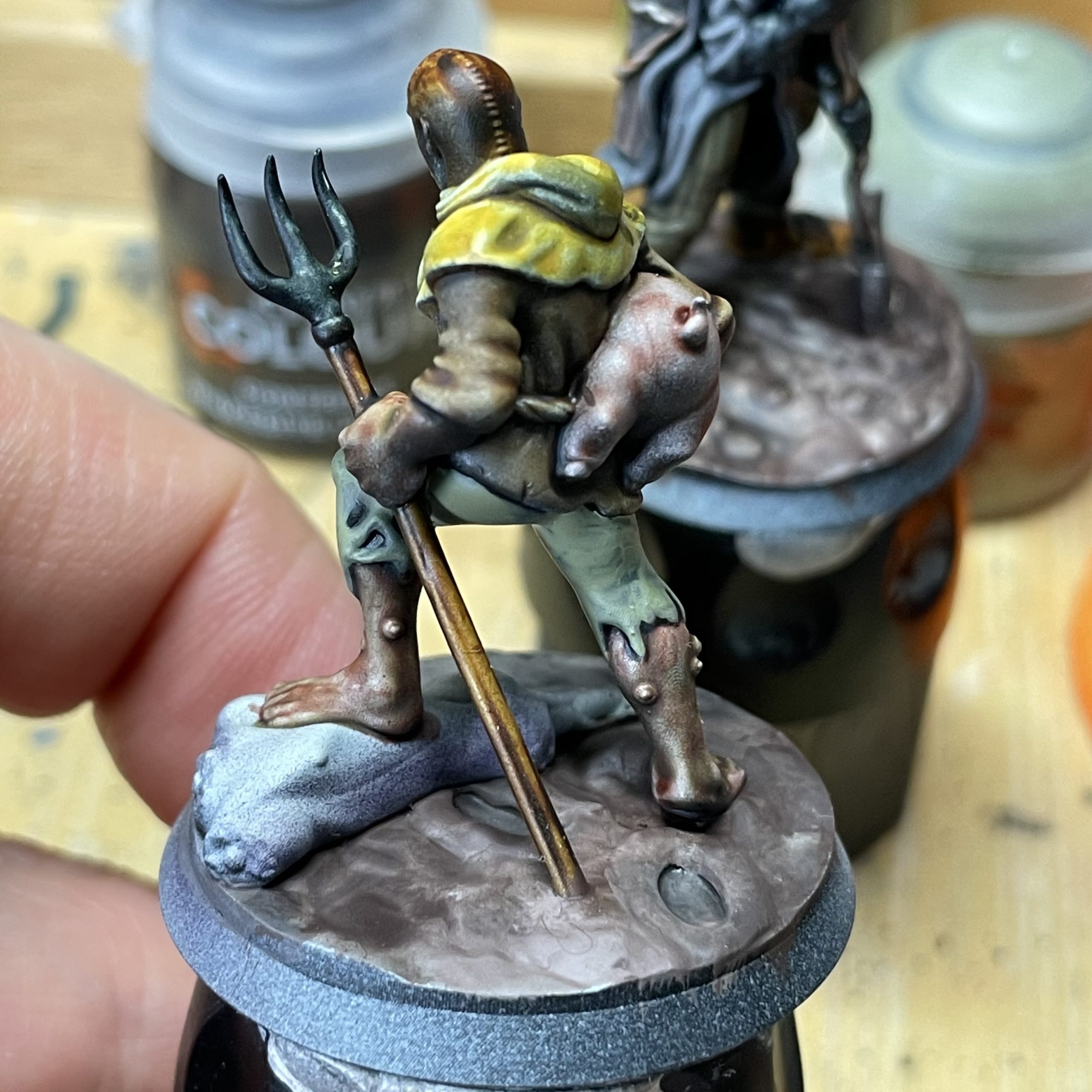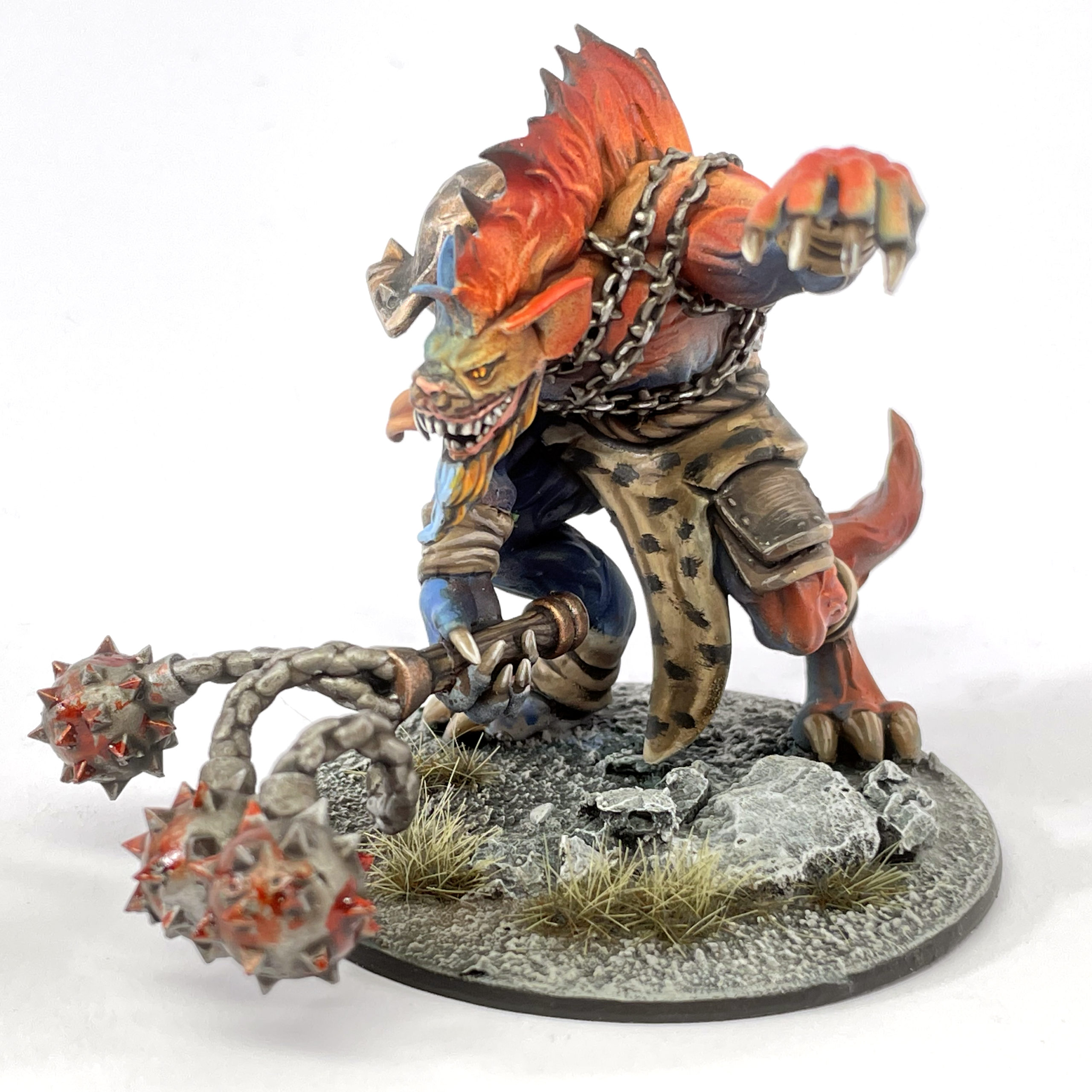 The Gnoll Demon Lord was my personal highlight from this collection. Not only where the colors with the airbrush a good starting point, but also all his other areas like leather, metal (the chains were made with some great love for details!) were a joy to paint. In this scale and size, everything on this beast was well shaped and the contours really helped as a guide for your brush. You can quickly get some simple shades here, deepen it with washes and if you like, there’s also enough room to make some fancy freehands. Please ignore my attempt at tiger-striped loin. I need to train this more. And i must confess, that during painting, one time i dropped him and he burst into over half a dozen peaces. I was able to glue him back together, but a bit of his teeth and his fur were lost due to my clumsiness.